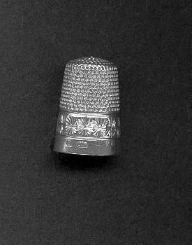 Silver thimble with English hallmarks. In perfect cndition. Plain narrow band at rim with marks - 8 (size) CH (Maker Charles Horner) Lion passant Chester 1896. Wide band of pattern above - mums or daisies one row around then knurling to and over top.
