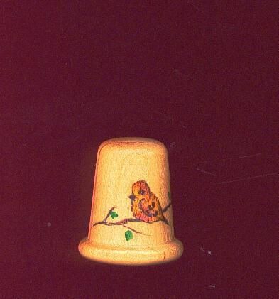 Wooden thimble with roll type rim. Hand painted brown bird on twig with green leaves. Signed Collette.