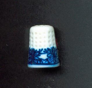 White glazed porcelain thimble with wide band of blue flowers above a narrow white rim . Knurling from band to top. Row of circular indentations around top. No marks.