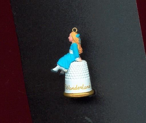 New CollectorÕs Series Keepsake Ornament. Heavy brass thimble, enamelled white except rim with blond girl dressed in blue sitting on thimble. Hanger in hair. ÒAlice in Wonderland 1995Ó on band. Inside label with ÒCroiwen 1995 Hallmark Cards Inc.Ó Box says Canada on back and ÒHandcrafted - Dated 1995Ó.