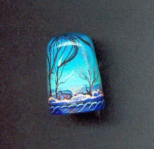 Hand painted wooden thimble from Russia.Blue background with rounded top. Winter scene painted of trees, white snow, low buildings. Border of deeper blue with whte sÕs around. Inside red. Signed inside ÒA.Koporeel 79950