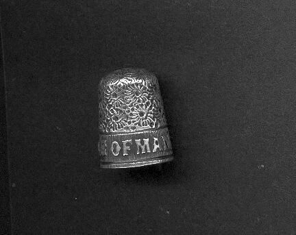 Silver Souvenir thimble. Wide band at rim with Isle of Man and the logo - man with 2 legs, 1arm ,plus English hallmarks - J.S. (maker James Swan) 1899 and Birmingham. Chrysanthenum pattern from band to and over top.