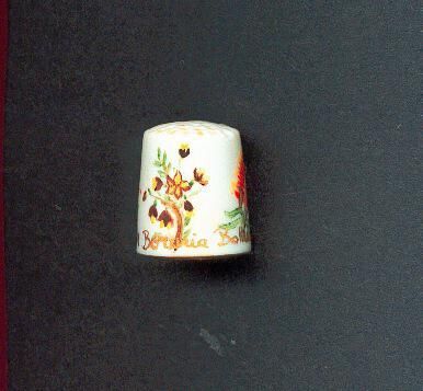 Ceramic white unglazed, hand painted Souvenir thimble. Hand painted flowers of Australia - bottlebrush. nodding greenhood, spider flower, borania -= all in colour with gold lettering of names underneath. Base also gold. Slightly rounded top is knurled.Signed inside in gold ÒJudy Dyer 1978 AustraliaÓ