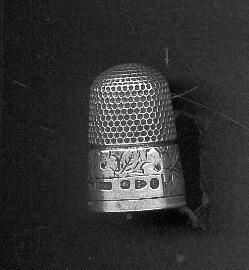 Silver thimble with narrow rim. Wide band of pattern above - 5 petalled flower - single rose - with leaves and cartouche. English hallmarks in pattern - 15 (size) Chester 1897 lion passant. No makers mark.