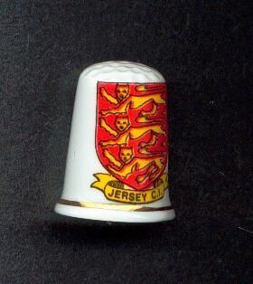 White glazed bone china Souvenir thimble, slightly fluted. Gold band near rim. Coat of Arms of Jersey Channel Islands in red and yellow on thimble..lightly rounded knurled top. Inside Birchcraft Fine Bone China Made in Gt. Britain and logo of trees and leaves.