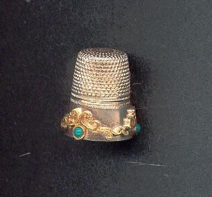 Silver thimble with jewelled band. Wide band of applied scrolls, gold plated and small turquoise stones. Pattern repeat 3x,. Knurling from band to and over top with Gabler logo top center. Outside gold wash. Inside silver. 925M inside top.