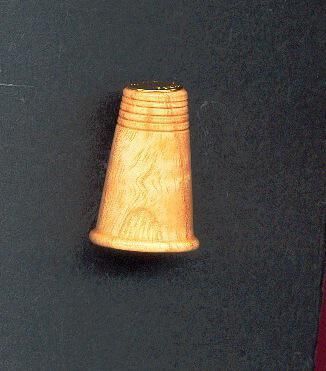 Wooden thimble made from the stalk of a Cabbage grown on Jersey Island, to tree (8Õ) size. Rim plus 5 grooved lines near top. Thimble tall, wide at base, narrowing greatly to top. Top has gold coloured disc reading ÒJersey CabbageÓ.