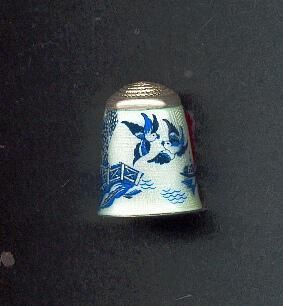 Enamelled silver thimble. Willow pattern in blue on white enamel on body of thimble. Silver rounded knurled top. Inside apex are several marks - canÕt read them.