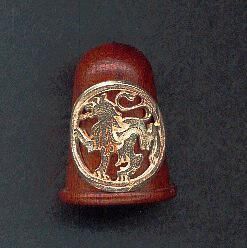 Wooden thimble with silver applied disk. Mahogany - reddish brown - thimble with raised rim , lovely grain, rounded top without knurling. Large silver cut out disk of lion applied to body of thimble. No marks.
