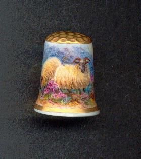 White glazed hand painted thimble, gold knurling on slightly rounded top.Slight fluting with gold line at rim. Hillside scene in colour with 2 horned sheep. Signed inside ÒPayneÓ