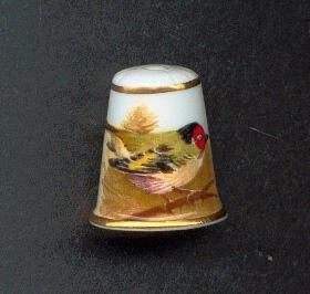 White, glazed slightly fluted hand painted thimble with gold band at rim and top. Flat top with lines radiating from center circle.Bird with red on head standing on grassy background. Signed NC. Inside thimble Russell.