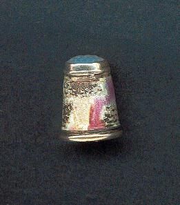 Silver thimble, with blue stoine top. Body of thimble was originally enamelled in colours - either worn or broken off. All that remains is the colour. Inside apex 935 S plus faint signs of 3 crowns.