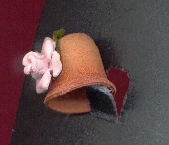 Leather thimble, light tan in colour with a darker brown near rim. Made like a hat with a pink leather many petalled rose and leaf in front. Stamped Canada inside top.