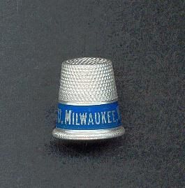 Aluminum Advertising thimble with blue band. Rolled ribbed rim. Advertising ÒInd. Coffee Co. Milwaukee, Wis.Ó No marks