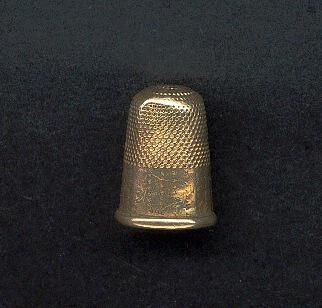Brass thimble with rolled rim. Wide band of pattern. 3 horizintol rows of vertical lines. Narrow vertical rows of triangles around. No marks.
