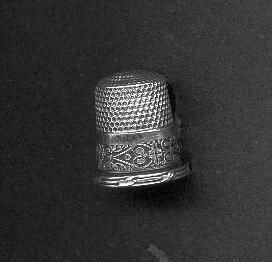 Silver thimble with raised patterned rim and wide band of pattern above rim. Rope design rim. Pattern above called Renaissance. Inside logo of Ketcham McDougall and Sterling.