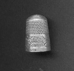 Silver thimble with narrow plaIin band at rim and wide band of pattern above. Pattern of leaves and thistles. English hallmarks -- 6 (size) JC&S (maker) Birmingham, lion passant and year mark for 1905