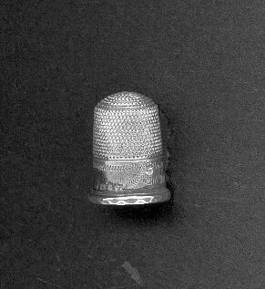 Silver thimble with English hallmarks. Facetted rim, wide band of pattern abov rim Entwined zigzag scrolls. Marks on band J.F(James Fenton - maker) 10 (size) lion passant, Birmingham and the year mark for 1898