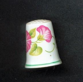 White bone china slightly fluted thimble. Unglazed knurled top. Screen printed floral sprays - 2 large pink petunias with leaves one side, other side smaller spray of 3, five petalled blue and purple flowers and bud. Inside Royal Worcester logo.