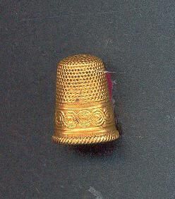 Brass thimble with rolled rope rim. Wide band of pattern above.Pattern of twisted spirals around..Knurling from band to and over top. Center top has many petalled flower in center. No marks