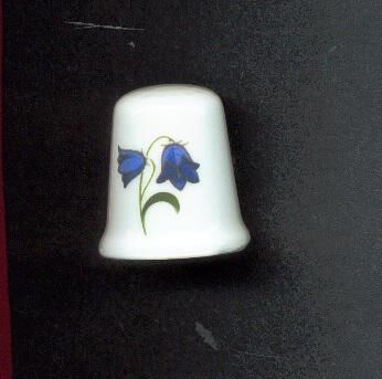 White glazed bone china thimble with decal of 2 bluebells with leaves. Stamped inside ÒSt. Andrews Pottery, ScotlandÓ