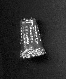 Tall Mexican silver thimble.Wire work design at rim. Vertical lines of indents around-- 12 vertical rows. Side seamed. Waffle knurling over top. Stamped inside Mexico TP-93