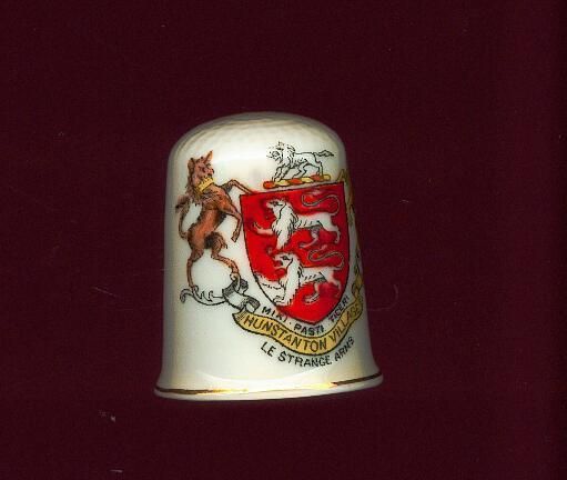 Large bine china drinking measure thimble. Slightly fluted with gold line at rim. Ciat of Arms in red and gold of Hunstanton Village on thimble. Underneath printed Advertising ÒLe Strange ArmsÓ Inside logo of J&S IceniN England.,