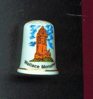 White, glazed bone china Souvenir thimble, slightly fluted with fine gold line at rim. Decal of the Wallace Monument in colour near Stirling Scotlanf. with ÒWallace MonumentÓ in black print below. Inside logo and ÒBirchcraft Fine Bone China Made in Great Britain.