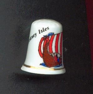 White, glazed bone china Souvenir thimble, slightly fluted with fine gold band at rim. Coloured decal of sailing ship with red and white sails and ÒOrkney IslesÓ printed in black over ship