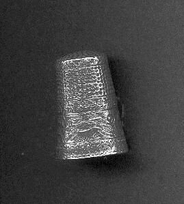 Tall pewter thimble made as they were in the 16th century. Depicts hunting scenes around body of thimble. Knurling on rounded top. No marks