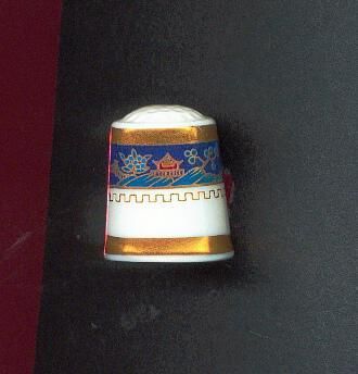 White bone china thimble squat shape, rounded top with knurling. Wide gold band at rim. Oriental design on top half of thimble with blue background colour and a wide gold band at top. Gold Greek key design on white below the top design. Inside in gold Royal Doulton with a crown and lion on top. Fine China M ade in England. Decal.