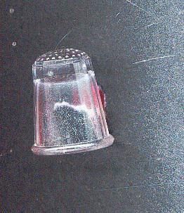 Blush pink clear flass thuimble. Rolled rim.Many panels around body of thimble. Knurled top. No marks.