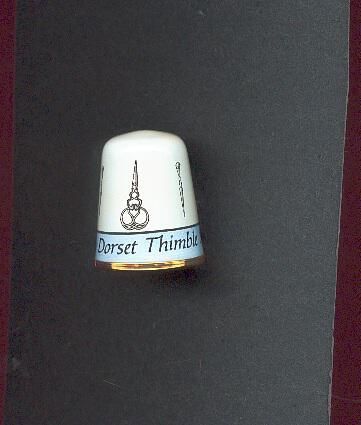White enamelled, brass, Commemorative thimble.Gold metal band at rim.Pale blue enamel band above with Ò The Dorset Thimble Society 1997Ó in black. Whitre enamel above with embroidery scissors and punches around. Inside logo and Made In England Crummels.