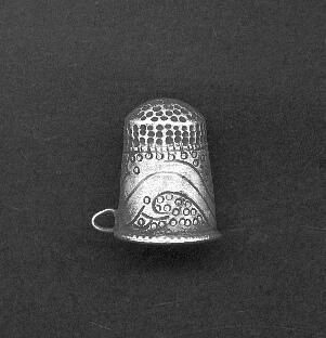 Silver thimble with small ring at rim. Side seamed. Knurling 1/4 way from and over top. Design around thimble of plain leaves, small circles between. No marks.