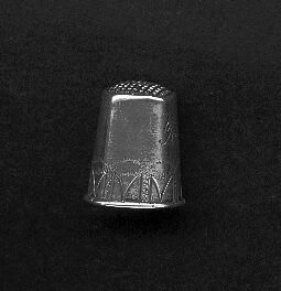 Silver thimble with rolled rim. Band of pattern above rim, then plain to top except for name Ruth. Top - waffle indentations - inserted.Top steel.Inside marks - 3 crowns of Sweden S (sterling) EL (maker?) Ft (Size?).