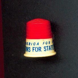 Early plastic Political Advertising thimble, cream with red top. Blue printing advertising ÒAmerica for Americans Byrns For StateÕs AttorneyÓ Inside top B&B St. Paul U.S.A.