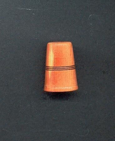 Tall wooiden thimble of juniper wood. Medium brown colour with lighter markuings. 3 black lines,indented, around mid point. Slight rise at rim. Flat top - no knurling. No marks.