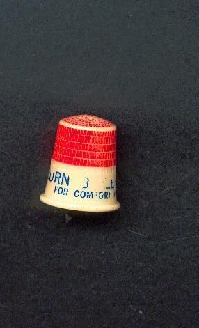 Earlyplastic Advertising thimble with rolled rim. Cream base, red top, blue printing. Advertising ÒBurn B---More Coal For Comfort and SatisfactionÓ Inside apex St. Paul.