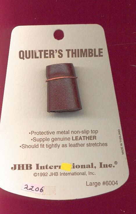 QuilterÕs Thimble made of leather, dark brown in colour, inside white. Leather overlaps. Inserted non-slip gold coloured metal waffle knurled top. On card.