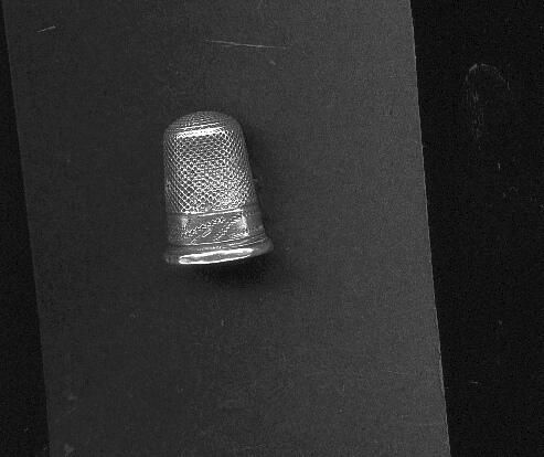 Unmarked silver thimble with facetted rim. Band of zigzag scroll pattern around. Vuctorian style.