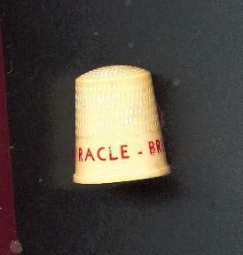 Plastic Advertising thimble, cream colour with red printing. Advertising ÒMiracle -Brush-OffÓ Oval [pouncing on body of thimble, round on top.No marks