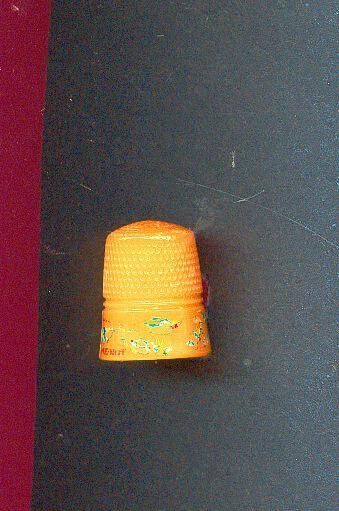 Early plastic thimble, golden brown in colour with wide plain band at rim. Painted decoration on band - birds and flowers with words ÒForget Me NotÓKmurling from band to and over top.