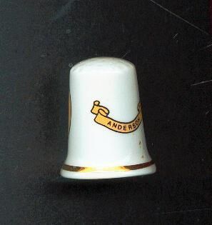 White glazed china slightly fluted thimble. Gold band at rim.Crest on body of thimble consists of a gold belt inside of which is a green tree on a red and white base. Words ÒStand SureÓ on belt. Other side of thimble has gold banner with name ÒAndersonÓ