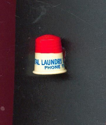 Early plastic Advertising thimble. Cream with redtop. Blue printing. Advertising ÒCapital Laundry & Cleaners Phone 7767Ó No marks.
