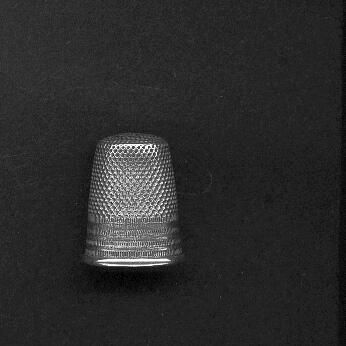 Unmarked silver thimble with rolled rim. Wide band above rim with 4 horizontal rows of vertical lines. Punch mark above first horizontal row. Knurling to and over somewhat dented top.