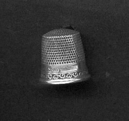 Silver thimble with rolled rim. Narrow band of scroll pattern above rim. Narrow plain band above with marks. Faint remains of Goldsmith Stern mark and word Sterling. Size also on band. Knurling from this to and over relatively flat top.