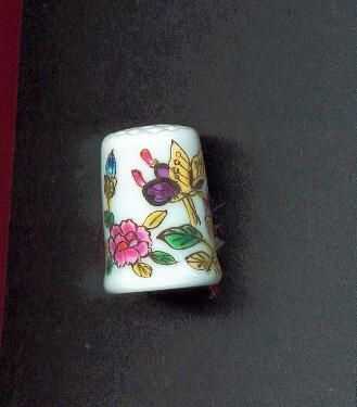 White glazed porcelain thimble, straight from top to slight fluting at rim. Floral decoration in greens, blues , purple and pink looks hand painted. No marks.