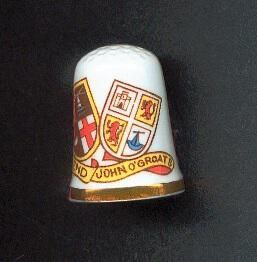 White glazed bone china Souvenir thimble, Slightly fluted with gold band at rim. 2 shields in colour and banner below with ÒLands End John oÕ GroatsÓ On reverse ÒDistance 900 Miles 1440 KMÓ Inside Caverswalll U.K.