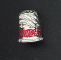 Aluminum A dvertising thimble with rolled vertically lined rim. Advertising on red painted band -paint loss-ÓMalkinÕs BestÓ Dents.