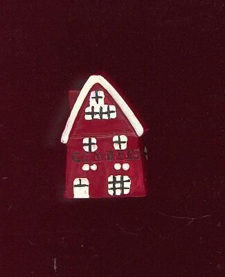 Decorative thimble in the shape of a 3 story house with white windows, white door. Colour of house is a deep red. Stamped Gimbels on front and Gimbles Thimbles 1996 on back.